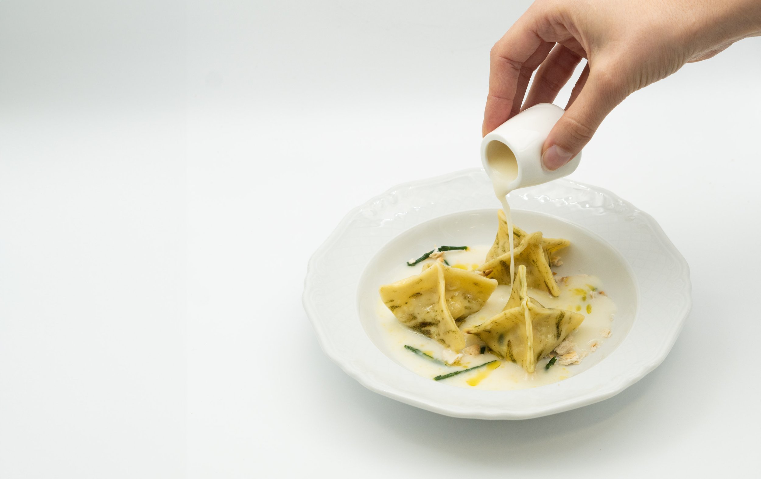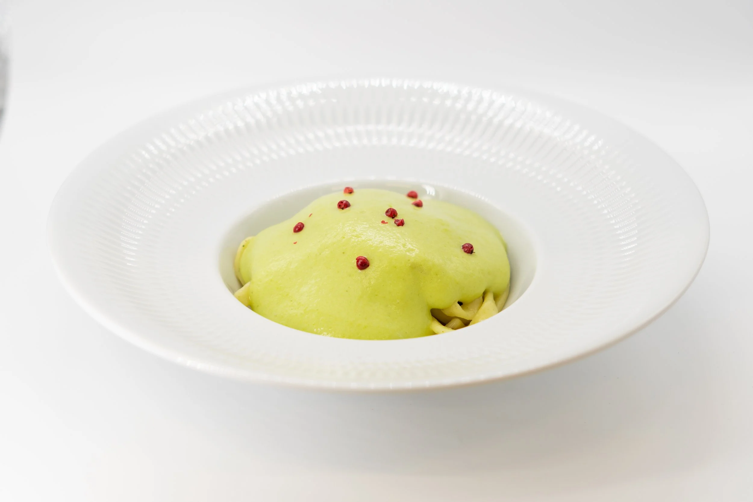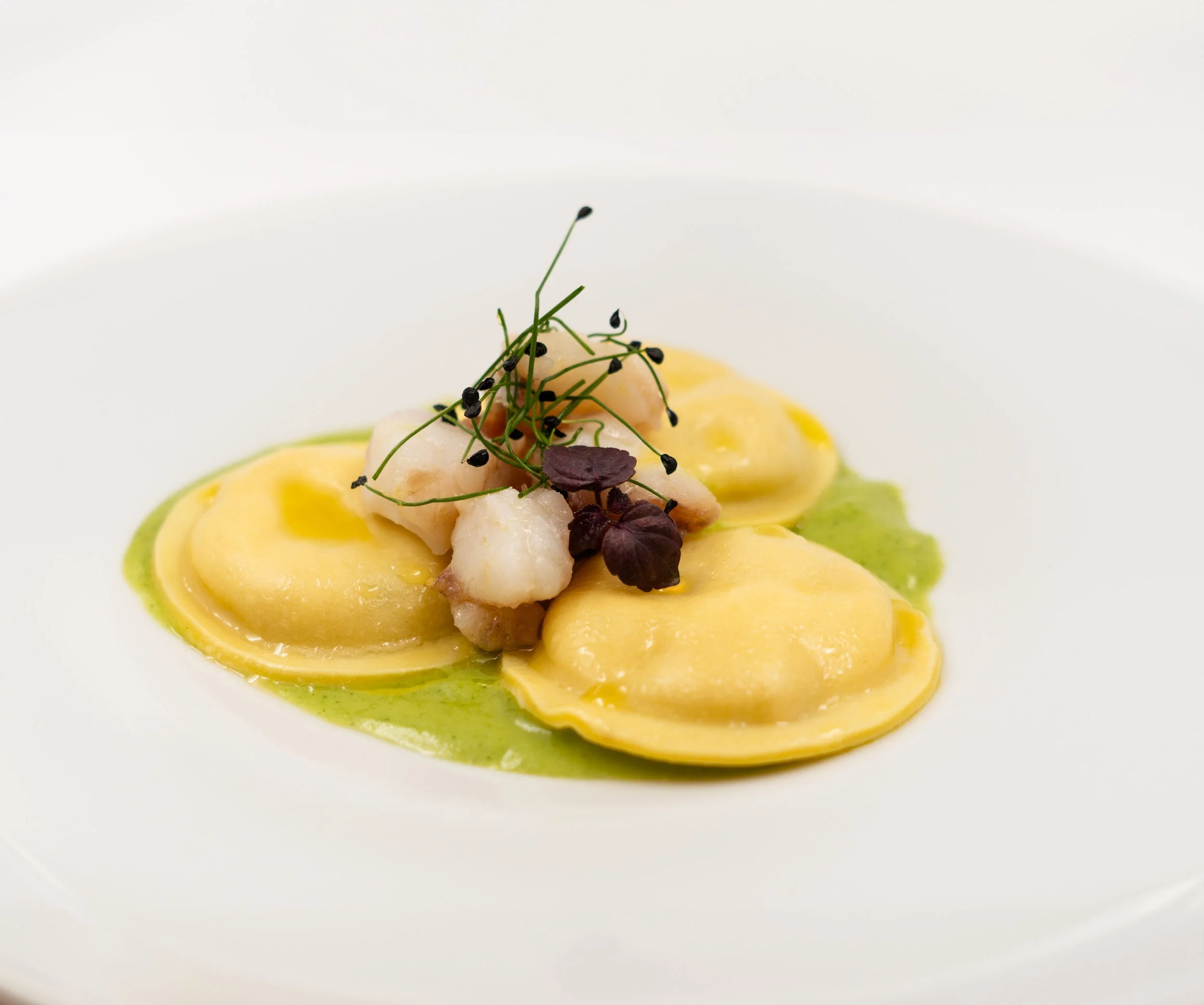 Ravioli alla nerano con rana pescatrice e crema di zucchine.