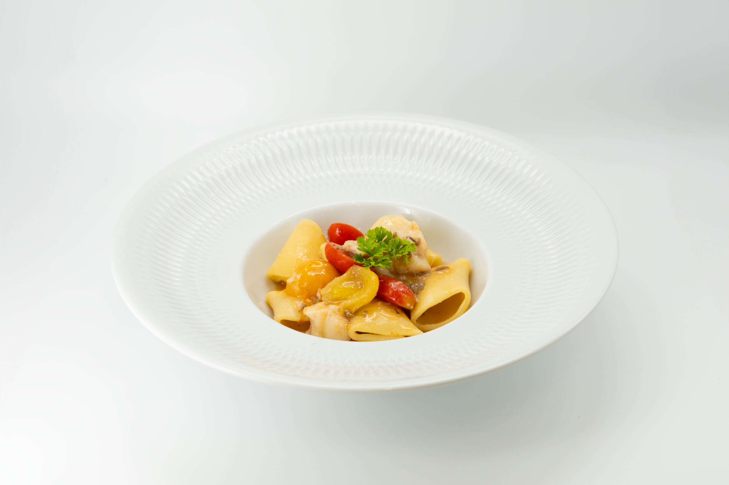 Paccheri, datterino giallo e rosso e rana pescatrice.