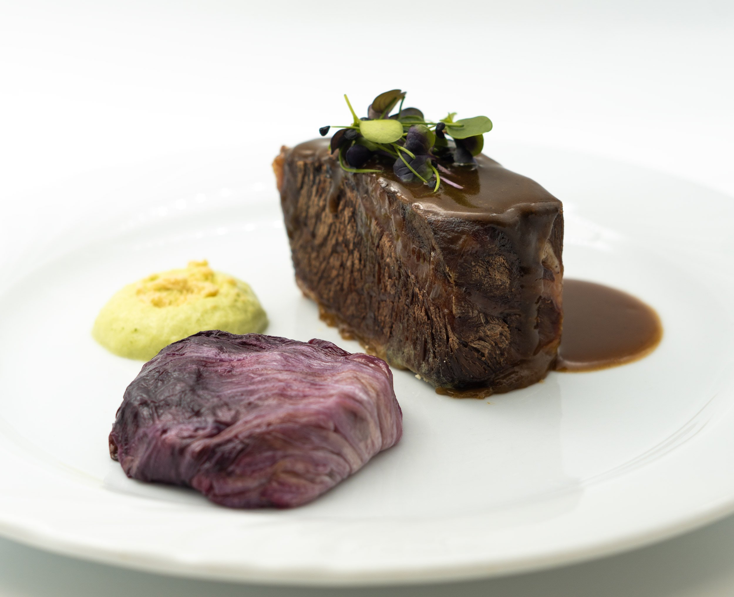 Succulento e avvolgente, il tortino di radicchio gorgonzola e noci bilancia la carne rossa brasata naturalmente, la spuma di lattuga pulisce il palato al termine del piatto.