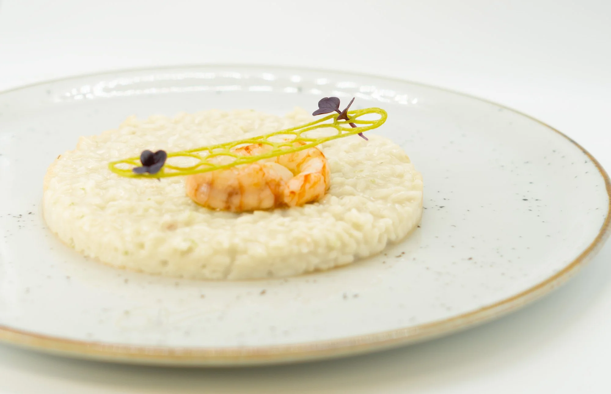 Risotto lime e pecorino con scampi e tuille al basilico.