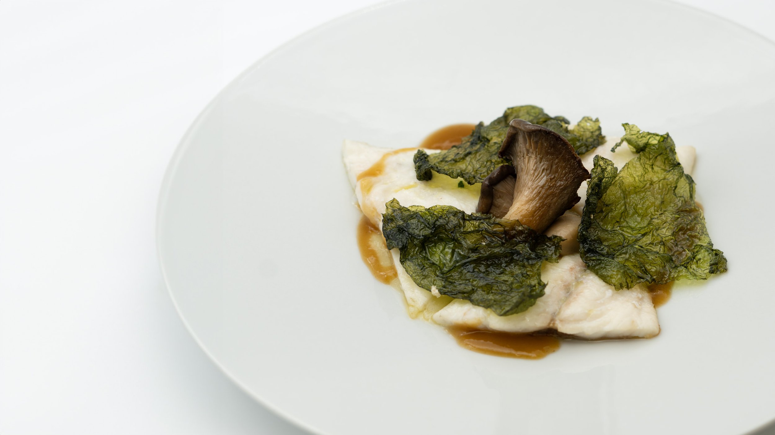 Ombrina con tortino di scarola millefoglie di patate e topinambur.