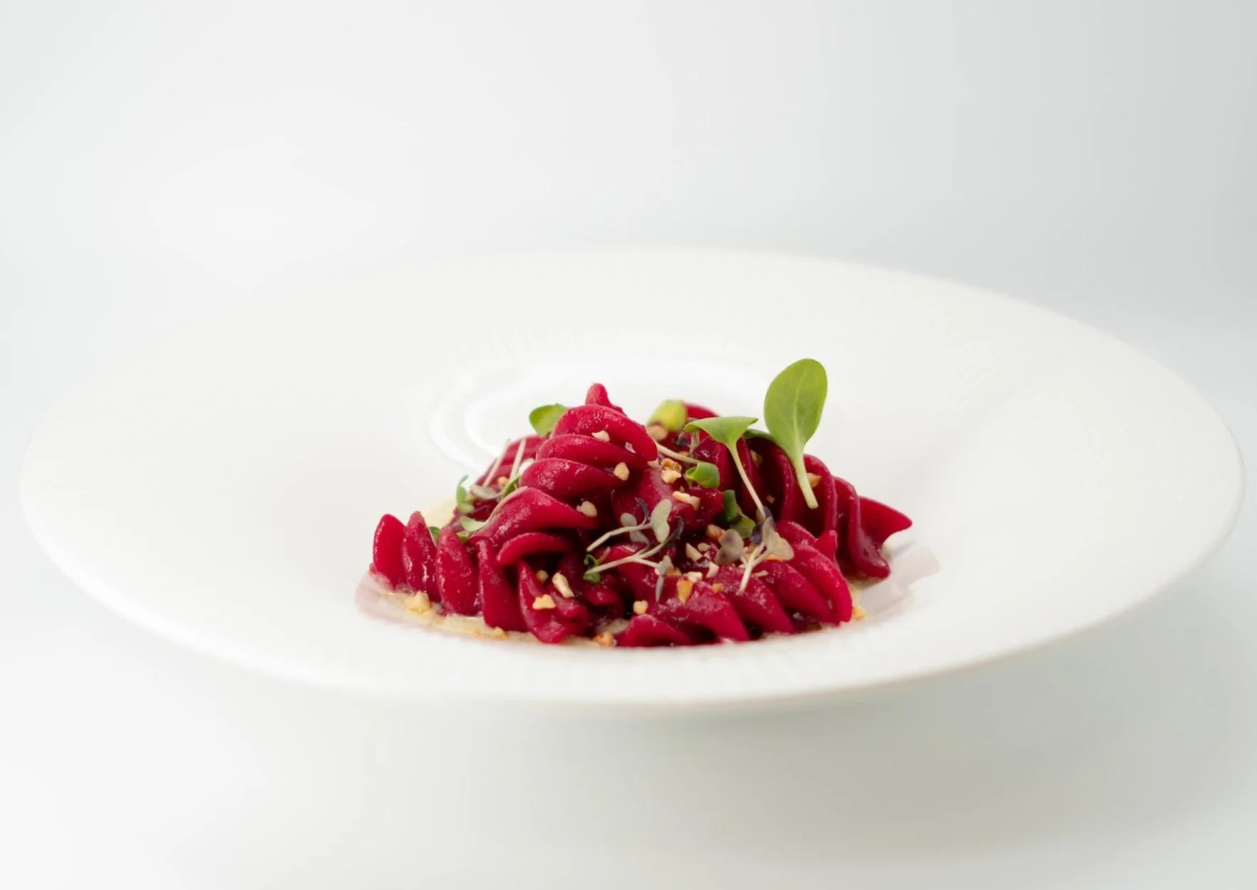 Fusilloni con rapa rossa su Blu di Comino e nocciole.