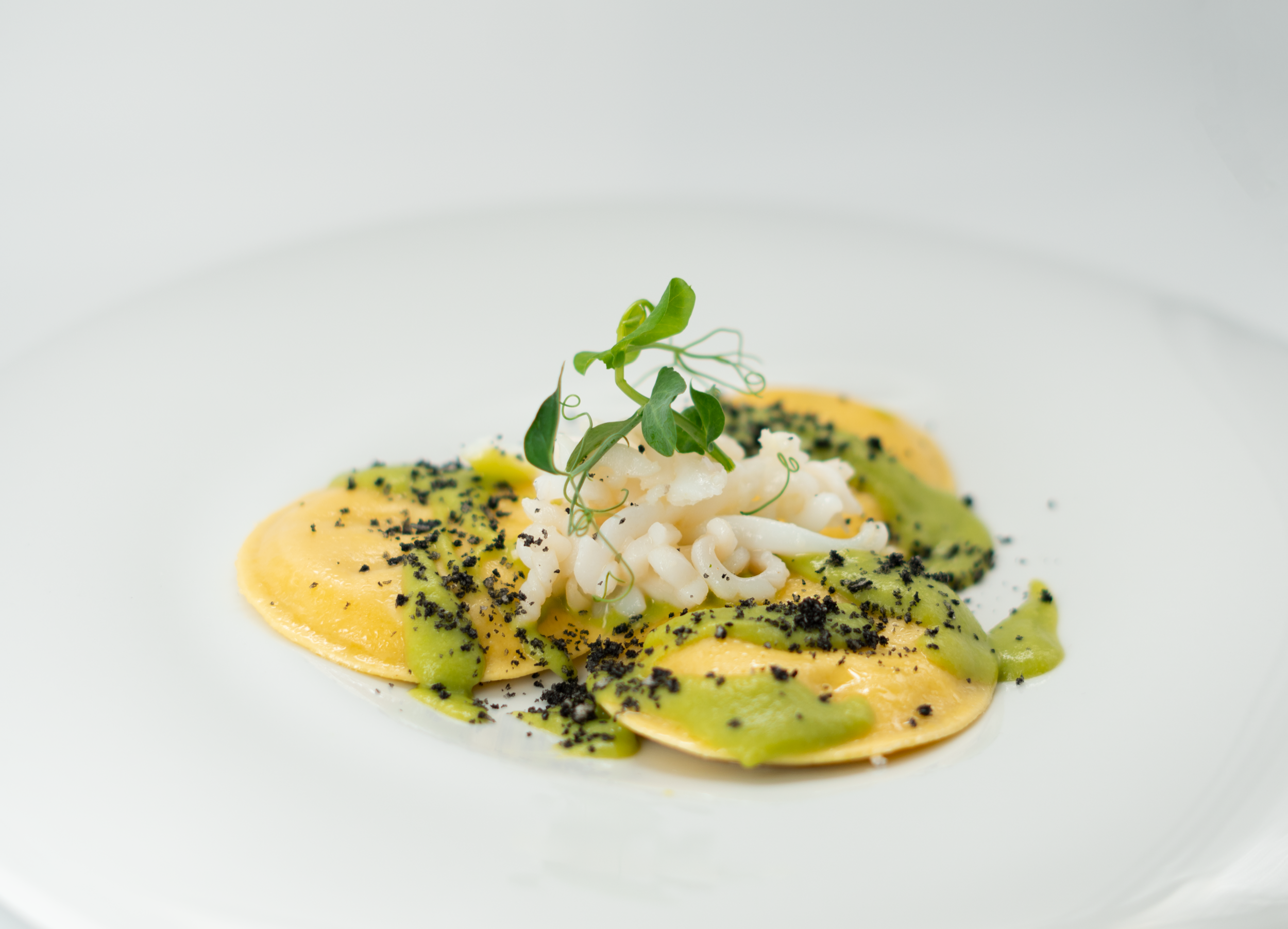 I ravioli, ripieni di capesante e gamberi, sono arricchiti dai fiocchi di calamari cotti al vapore e del crumble al nero di seppia, che conferiscono un sapore marino e una nota croccante al piatto.
