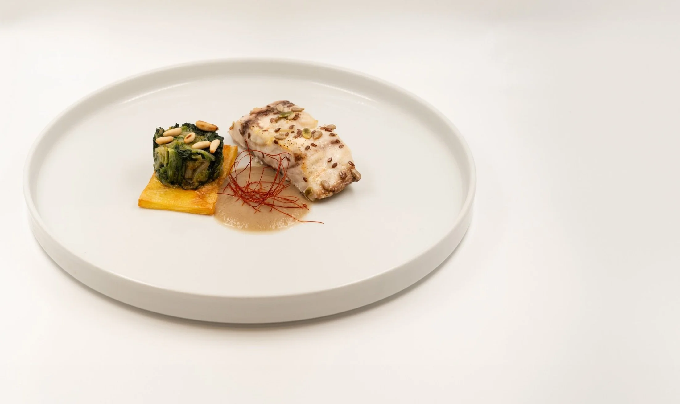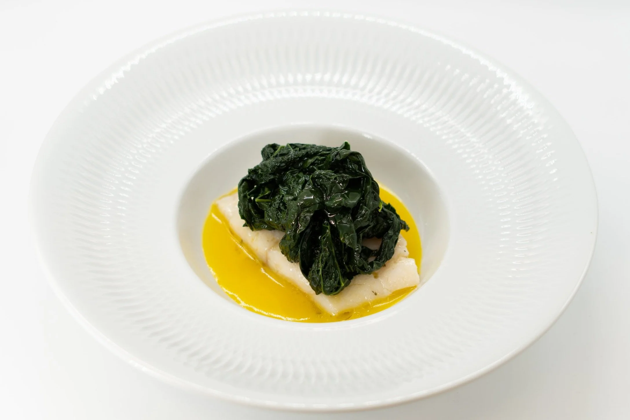 Merluzzo nordico su crema leggera di zafferano e cavolo nero.