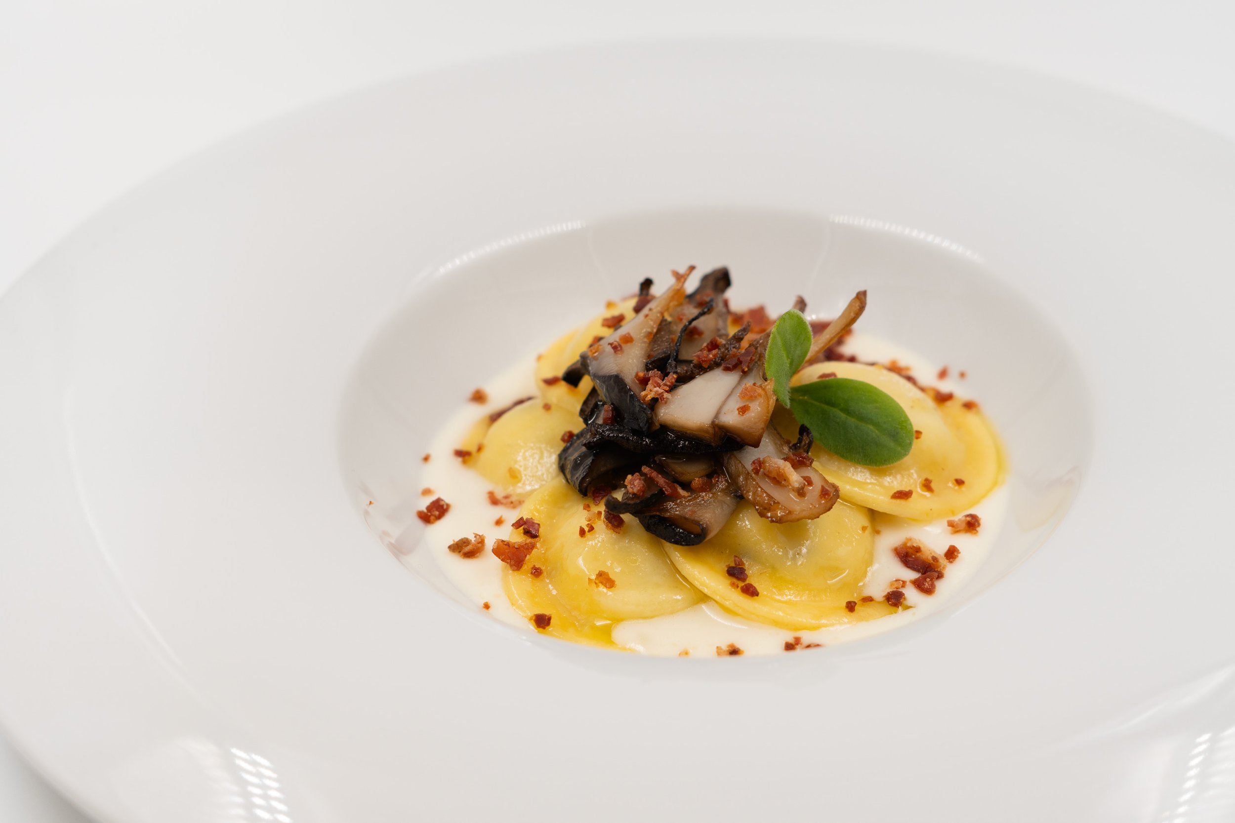 Un piatto che incarna eleganza e tradizione. Ripieno di ricotta delicata e profumata al tartufo. Servito su una fonduta di parmigiano cremosa e impreziosito da funghi cardoncelli e un tocco di bacon croccante, il piatto offre un perfetto equilibrio tra ricchezza e leggerezza.