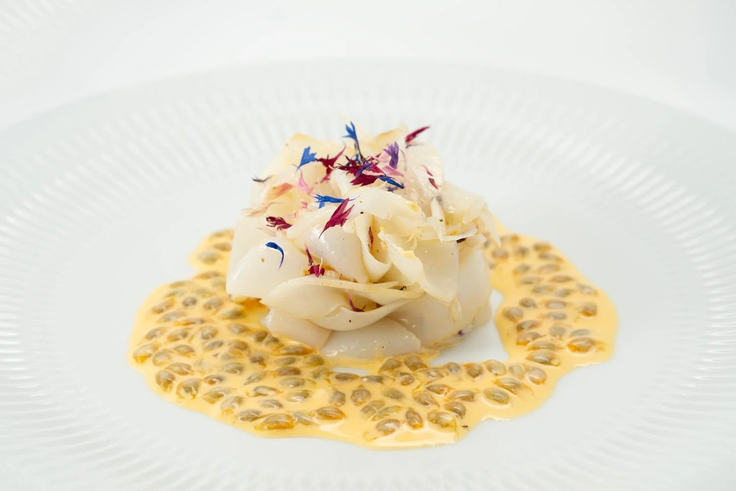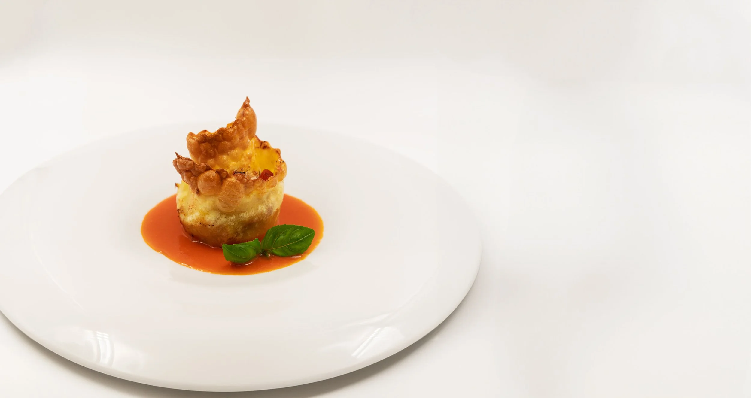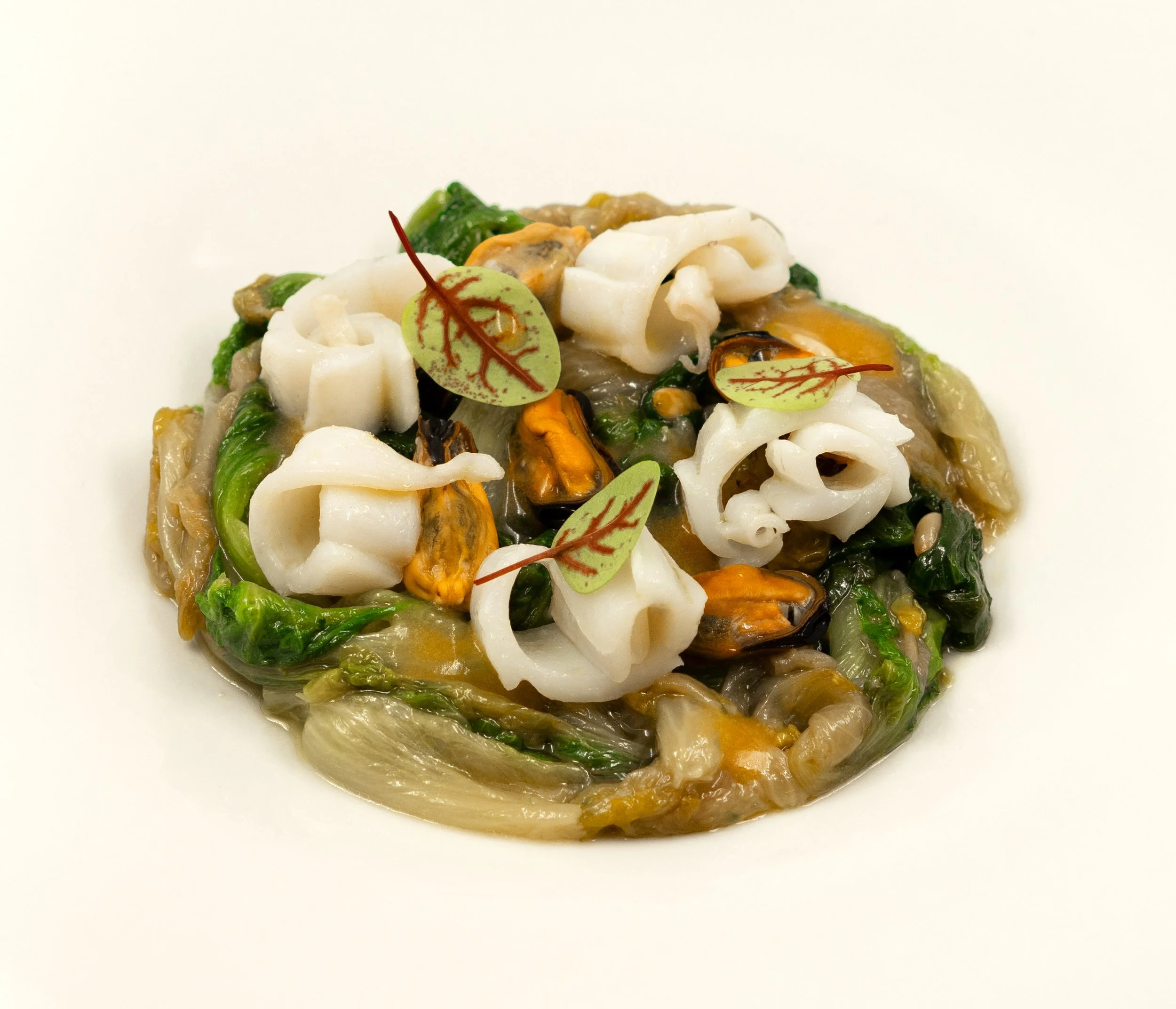 Una mini lasagna di mare che racconta la tradizione italiana con un twist moderno: sottili strati di pasta formano una rosa su un guazzetto di pomodoro mediterraneo, esaltando la delicatezza dei frutti di mare e regalando un’esperienza gustativa inconfondibile.