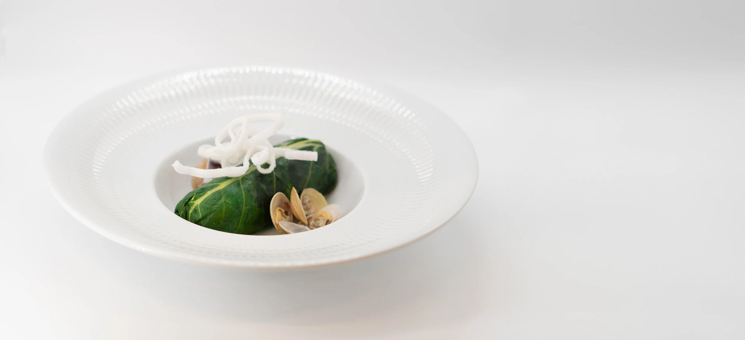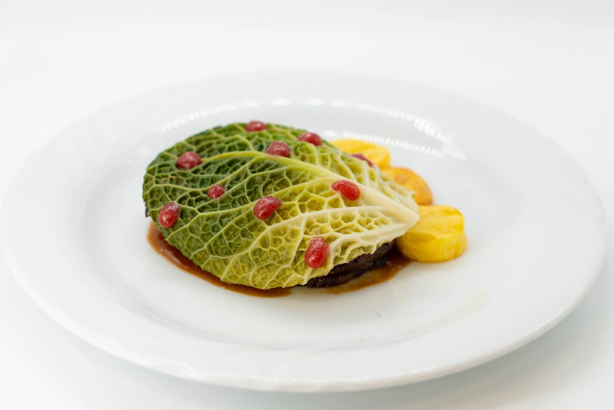 La copertura di verza, morbida e avvolgente, offre una nota terrosa e croccante, mentre la confettura di cipolle di Tropea aggiunge una dolcezza agrodolce.