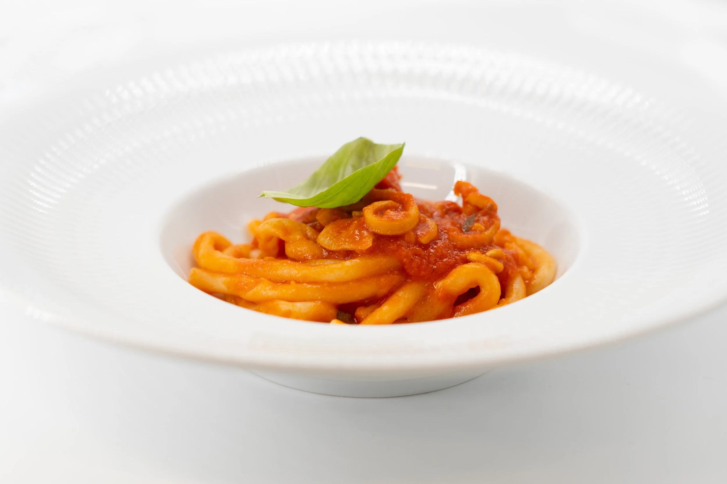 Gli scialatielli, pasta fresca e avvolgente, sono conditi con la dolcezza dei pomodorini datterino lavorati in piu passaggi e la tenerezza del totano. Un piatto che celebra la semplicità e l’autenticità dei sapori mediterranei, per un’esperienza culinaria genuina e appagante.