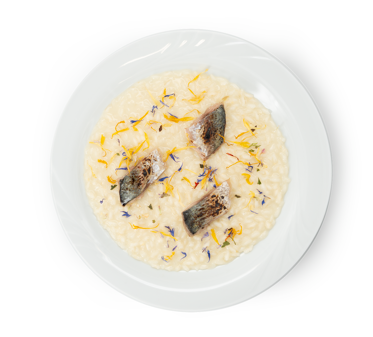 Risotto con caprino, trancetti di sgombro scottati e fiori eduli.