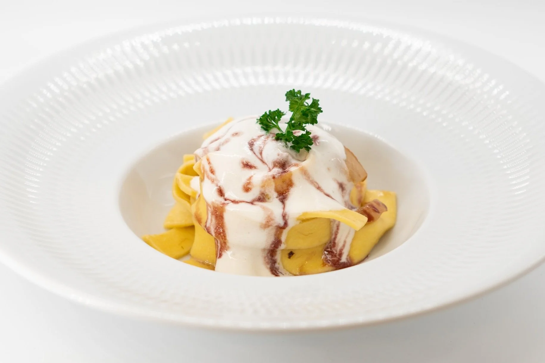 Le pappardelle consistenti e avvolgenti, sono accompagnate dalla ricchezza dei funghi porcini. La spuma di parmigiano reggiano aggiunge cremosità al piatto e viene contrastata dalla riduzione di Sagrantino che dona una nota agrodolce.