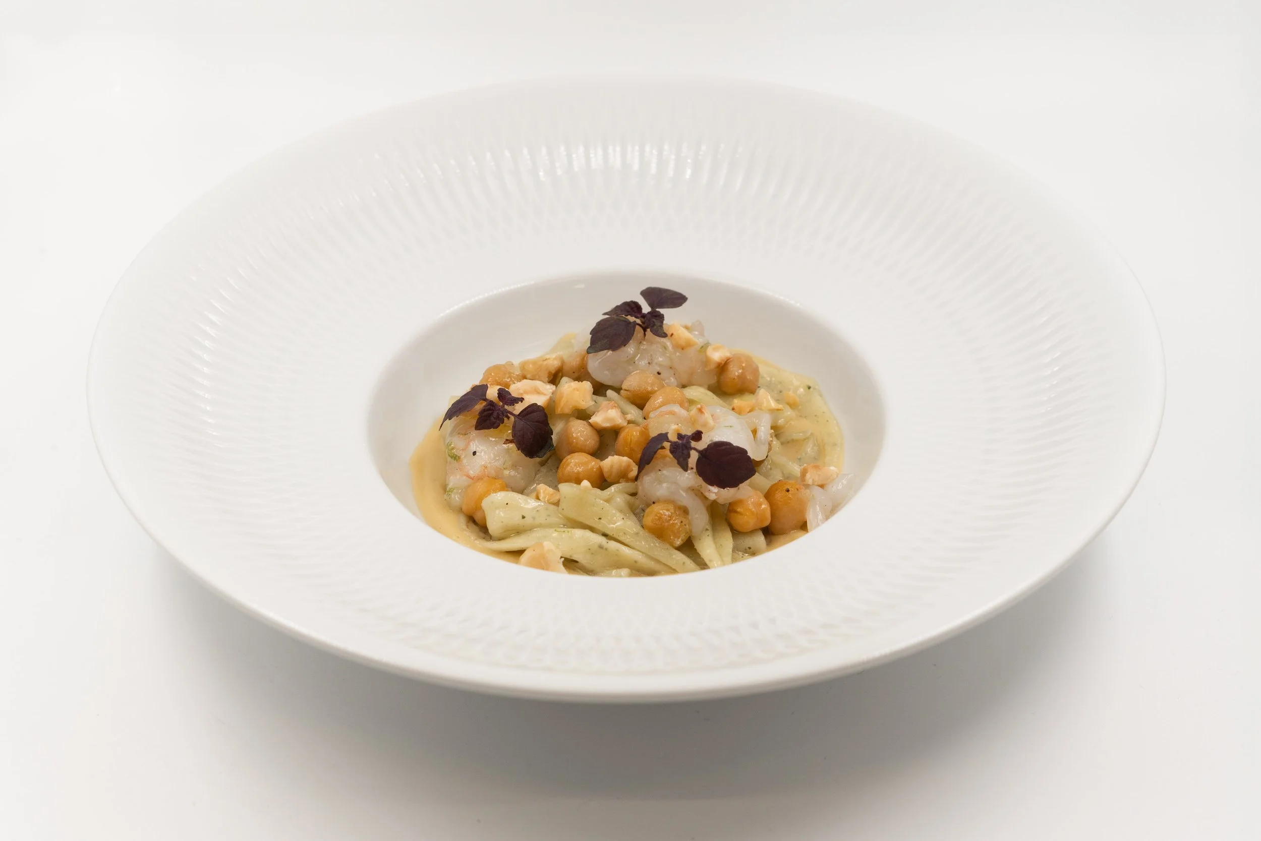 Maltagliati al basilico con ceci, crudo di scampi e nocciole.